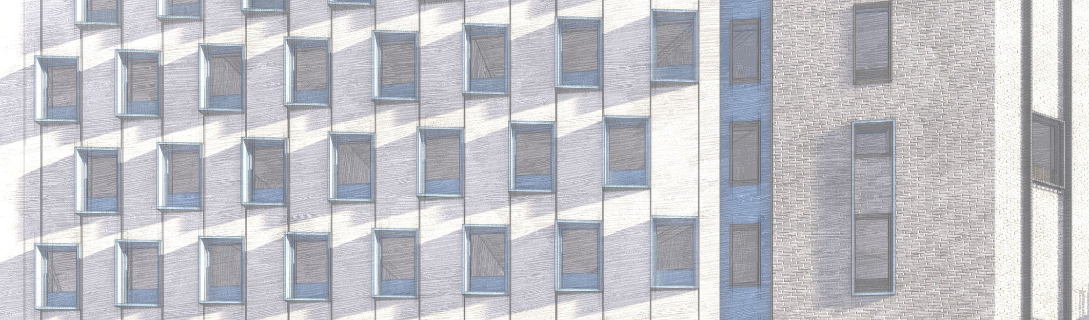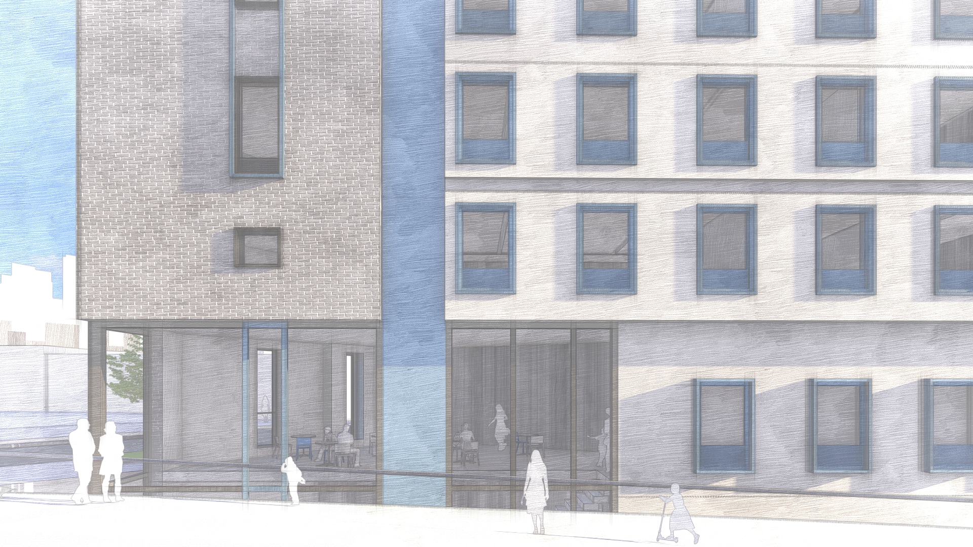 The site has two major characteristics which played a significant role in the building’s massing and façade design. The first is a noticeable grade change along East 147th Street that required careful consideration during the design process. The other is the triangular geometry of the site, presenting an opportunity to differentiate the massing into three parts. The first massing is the corner itself, which is emphasized through the use of a gray brick cladding, creating a heavy stone-like anchor for the other two facades. The sharp angle at the corner is also snubbed, allowing a sparse placement of windows for light and air into the apartments above while preserving its monolithic nature.