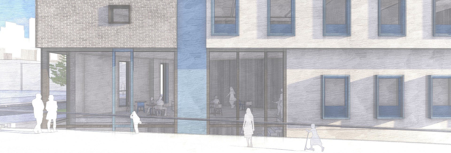 The other two massings use a rainscreen cladding system of light-colored fiber cement panels. Along the elevation of 147th street, the facade reflects its residential context through a uniform grid pattern of windows. Its simple composition creates a background against which the pedestrian level draws attention. Here, the façade is carved in creating a canopy that widens the street. As the street starts to slope downward, the façade angles into the building, aligning with the adjacent residential buildings. A lightwell is also added between the building and the street, introducing natural light and visibility into the programs below grade.